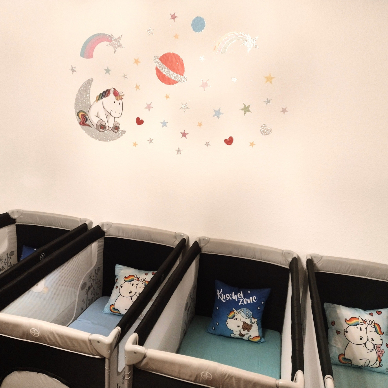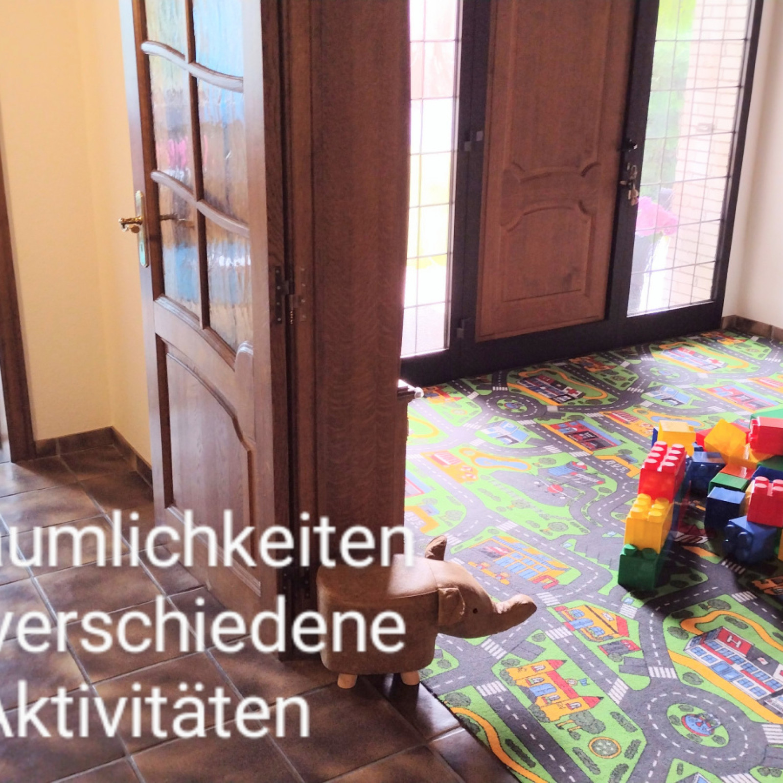 Kinder haben besondere Bedürfnisse an die Einrichtung: der Waschbereich hat einen Wickeltisch, Waschbecken und eine Toilette. Für den Mittagsschlaf oder um sich auszuruhen gibt es den Schlafbereich mit einer eigenen Matratze für jedes Kind. Die Essbereich ist besonders wichtig: hier bereiten wir – auch oft gemeinsam mit den Kindern – die Mahlzeiten zu und lassen es uns zusammen schmecken. In den Räumen gibt es verschiedene Bereiche zum Basteln oder Spielen – mache Bereiche werden auch für verschiedene Anlässe umgeräumt. In den Räumen wird natürlich nicht geraucht.